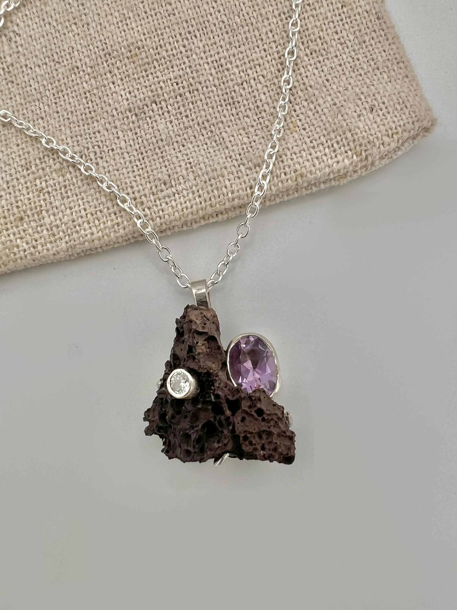 Cette pierre originelle est accompagnée d’une améthyste naturelle, dont les nuances profondes apportent une touche de sérénité et d’élégance.